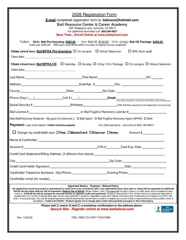 6-Hour/12-Hour Bail/Recovery Agent Continuing Education. Tuition includes current handouts, CE manual & certificates. (Tuition does NOT include parking, lunches, or overnight accommodations). MOST classes: Saturday & Sunday: 9:00 am to 3:00 pm. Class begins PROMPTLY at 9:00 am. The ZOOM option is available. Late arrivals may not be admitted into class. The Department of Insurance will be notified of course credits within 32 hours of class completion. Certificates will be mailed via USPS.